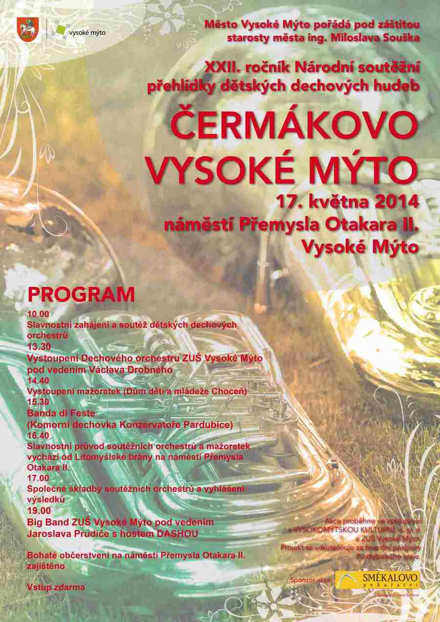 17. května 2014 pořádá město Vysoké Mýto XXII. ročník Národní soutěžní přehlídky dětských dechových orchestrů Čermákovo Vysoké Mýto. Tato významná kulturní akce se uskuteční již tradičně na náměstí Přemysla Otakara II. Letošní soutěže se zúčastní čtyři kvalitní soutěžní orchestry: Dechový orchestr mladých ZUŠ G. Mahlera Humpolec, Malohanácká muzika Jevíčko, Konice a Velké Opatovice, Dechový orchestr ZUŠ Vimperk a Sdružení dechového orchestru mladých Zlín. Dále se můžete těšim na vystoupení Dechového orchestru ZUŠ Vysoké Mýto pod vedením Václava Drobného, vystoupení mažoretek, komorní dechovku pardubické konzervatoře Banda di Feste, slavnostní průvod a na závěr vystoupí Big Band ZUŠ Vysoké Mýto pod vedením Jaroslava Prudiče se speciální hostem Dashou. Po celý den je připravené bohaté občerstvení a vstupné je zdarma. Celá akce se koná pod záštitou starosty města Ing. Miloslava Souška a za finanční podpory Pardubického kraje.