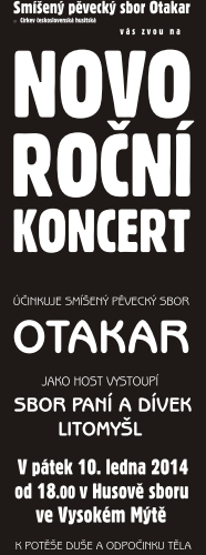 NOVOROČNÍ KONCERT smíšeného pěveckého sboru Otakar (jako host vystoupí Sbor paní a dívek, Litomyšl), se uskuteční v pátek 10.1. 2014 v 18.00 v Husově sboru ve Vysokém Mýtě.