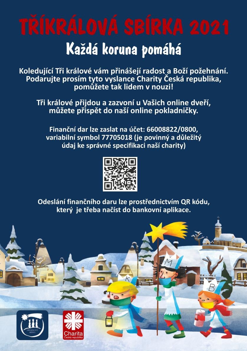 Navštivte ONLINE koledu na www.trikralovasbirka.cz a přispějte do ONLINE kasičky. Věříme, že vás online koledníci potěší stejně, jako by stáli u vašeho prahu. Až vám zazpívají, přehrajte si požehnání od Mons. Josefa Suchára z poutního místa v Neratově, stáhněte si dárek a podpořte, prosím, Charitu, která pomáhá nemocným a potřebným ve vašem regionu (stačí vyplnit název města, obce nebo PSČ).